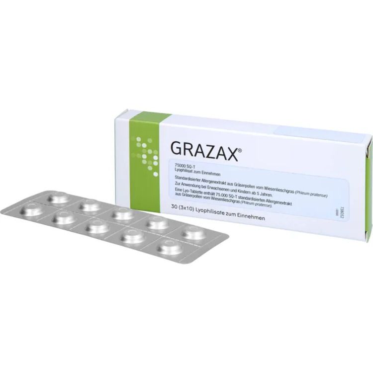 Гразакс выпускается в форме подъязычного лиофилизата — это таблетка, которая не запивается водой, а помещается под язык, где быстро распадается. Дозировка одной единицы — 75 000 SQ-T стандартизированного экстракта аллергена пыльцы тимофеевки (Phleum pratense). В упаковке 30 таблеток.
