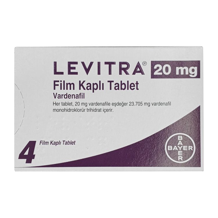 Препарат Левитра упакован в картонную коробку, внутри которой находится блистер с четырьмя таблетками. Упаковка снабжена информацией на турецком языке, которая включает название препарата, дозировку и активное вещество.