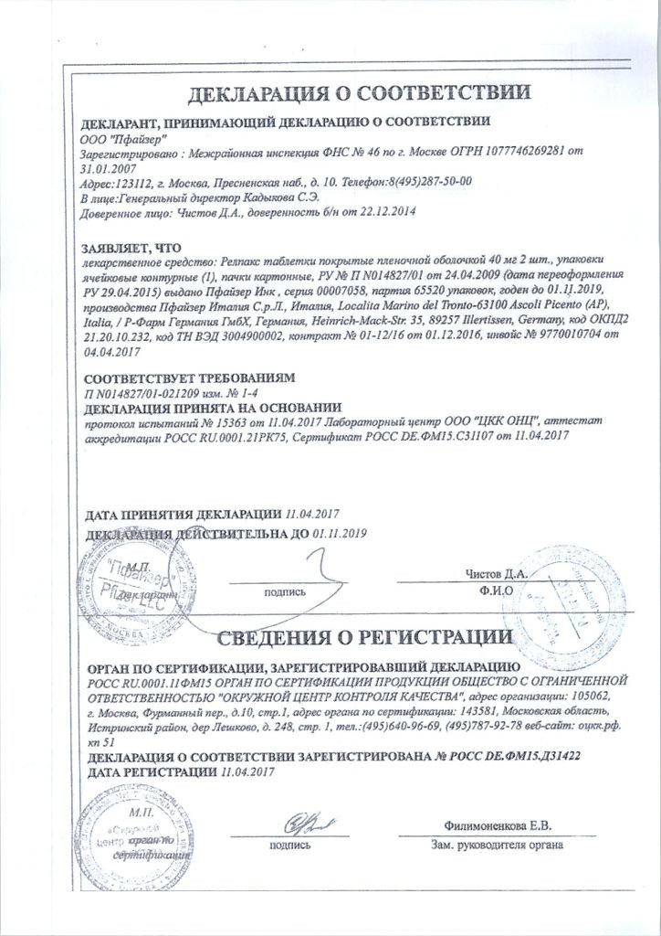 Прежде чем купить Релпакс 40мг в ближайшей аптеке, нужно обязательно проконсультироваться с врачом. Самолечение опасно для Вашего здоровья.