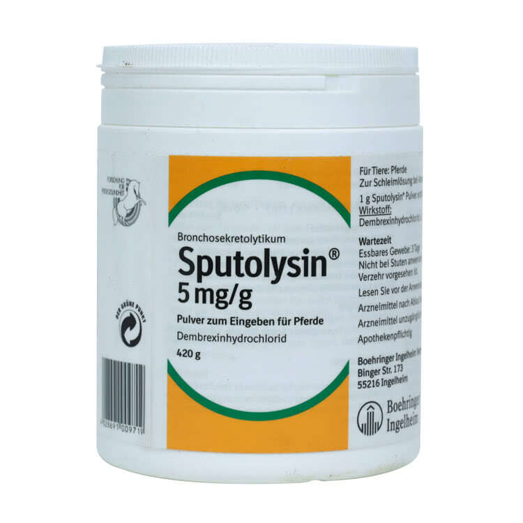 Стандартное назначение, предписанное инструкцией от немецкого производителя, предусматривает ежедневное употребление Спутолизина в расчете 0,3 мг на 1 кг веса животного. Раствор принимается вместе с кормом. Длительность терапии зависит от состояния лошади, но обычно составляет 1-3 недели. Муколитик также может назначаться совместно с препаратами, расширяющими бронхи (в частности с бронходилятором Вентипульмином).