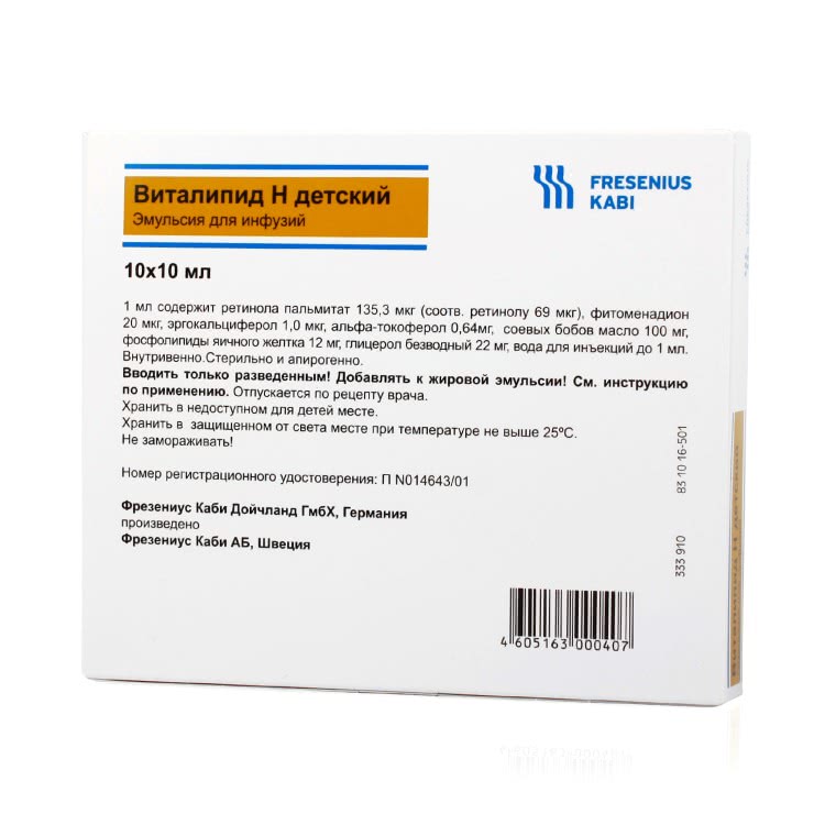 Виталипид N— это специализированная жировая эмульсия, которая используется для восполнения дефицита жирорастворимых витаминов (A, D, E, K) и энергии у детей, особенно в случаях, когда организм не может получать питательные вещества через обычную пищу или желудочно-кишечный тракт.